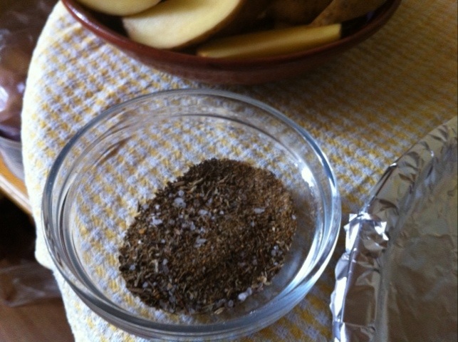 Готовим смесь пряностей. Мы использовали соль, перец, базилик и пряности для картофеля. Вы можете подобрать по своему вкусу. Одно из главных условий – много! Пряностей должно быть много!