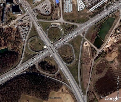Рис. 1. На рисунку зображено розв’язку на МКАД (Москва), один із лівоповоротних з’їздів якої постійно закорковано в наслідок великої кількості вантажних автомобілів.