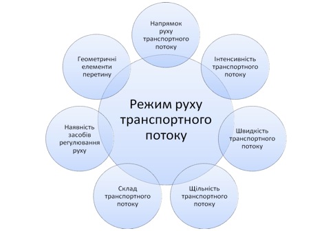 Кожний перегін і вузол на магістральній мережі вулиць і доріг міста має свій певний, характерний режим руху транспортного та пішохідного потоків. Нажаль, даний термін непоширений у вітчизняній науковій літературі, і відсутній в українських нормативних документах. Автори пропонують наступне його формулювання: “режимом руху транспортних і пішохідних потоків слід вважати характеристику умов їх руху на вулично-дорожній мережі міста”. Режимом руху транспортних потоків, у тому числі і на перетинах міських магістралей в різних рівнях можна вважати набір параметрів, до якого можна віднести напрямок руху, інтенсивність, швидкість, щільність, а також специфічні особливості й характеристики потоків транспорту, їх взаємний вплив і перерозподіл у часі й просторі.