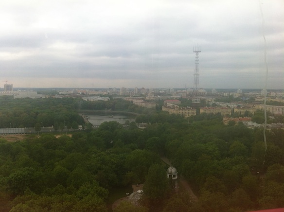 Около площади Победы, я обнаружил “Центральный детский парк” и непременно решил туда заглянуть! Купив порцию сладкой ваты (ну очень захотелось), я добрался до по-настоящему огромного колеса обозрения. Билет стоил смешных 4 800 руб. (это примерно 5 грн.) и, доев свое лакомство, я сел в кабинку. Колесо подняло меня на самый верх и город лежал предо мной как на ладони. Что можно сказать: Минск очень зеленый. Очень мало в нем многоэтажек (однако, признак пост-советских городов – спальные районы – здель в полной мере присутствуют).