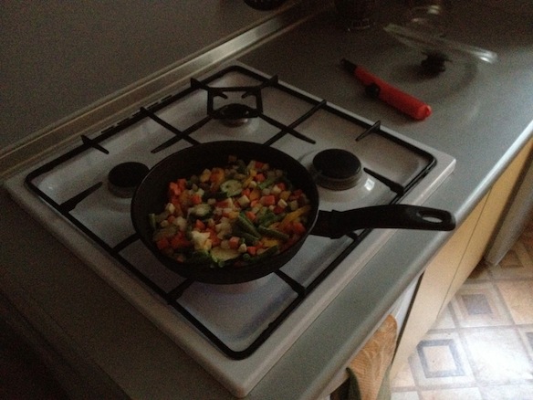 Вроде все классно – сам себе режиссер и все такое, но теперь это все нужно приготовить! Осмотрев дома продукты, я лишь почесал затылок: ЧТО я купил? ЧТО из этого можно приготовить? И главное – я не взял подсолнечное масло! На чем я буду жарить? В магазин уже идти не хотелось. План был следующий: на сухой сковороде я разморозил овощи.