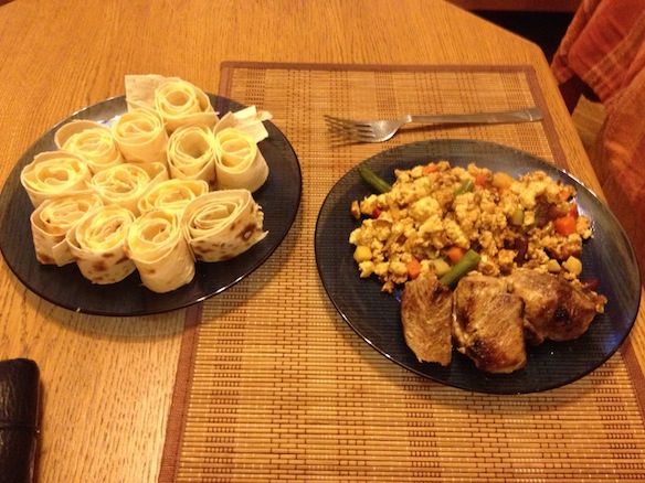 Омлет, не сомневайтесь, тоже пристал. Волевым решением, я его помешал лопаткой, добавив уже упомянутые овощи. Знаете, результат получился довольно неплохим! Еще добавлю сюда одну занятную закуску: на лист лаваша трете сыр, заворачиваете в колбаски, режете порционно и в микроволновку. Это вкусно!