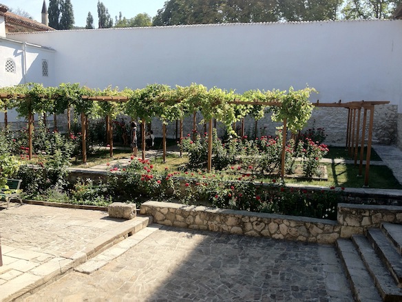 Бахчисарай поразил еще на вьезде. Дорога к нему как бы спускается, открывая чудесные виды, ведь город лежит в такой себе долине меж гор. С огромным радушием и восточным гостеприимством нас встретила хозяйка гостевого дома “Бахитгуль”, в котором мы остановились. Находится он за Ханским дворцом. Нам была организована целая церемония распития кофе, который хозяйка сама смолола за беседой с нами. А какой там номер – это что-то! Камень и дерево – никаких тебе кондиционеров или телевизоров. Сам двор утопает в зелени и цветах! Повсюду чувствуется любовь и забота хозяйки к своему делу. Мы пришли просто в полнейший восторг!