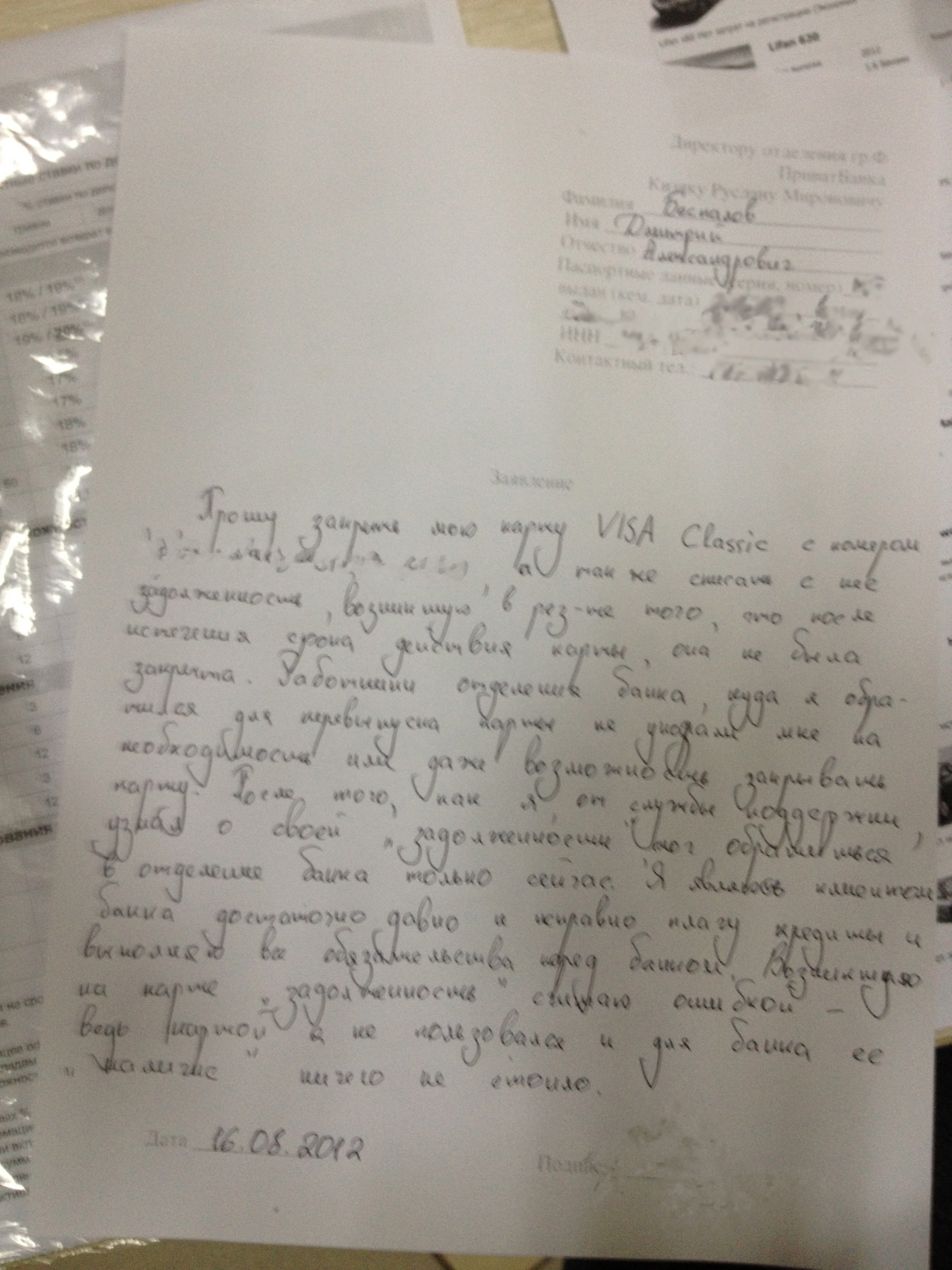 “Я, такой-то, такой-то, паспорт, серия, выдан, прошу закрыть мою карту Visa Classic с номером таким-то, а также списать с нее задолженность, возникшую в результате того, что после истечения срока действия карты, она не была закрыта. Работники отделения банка, куда я обратился для перевыпуска карты не указали мне на необходимость или даже возможность закрывать карту. После того, как я, от службы поддержки, узнал о своей “задолженности” смог обратиться в отделение банка только сейчас. Я являюсь клиентом банка достаточно давно и исправно плачу кредиты и выполняю все обязательства перед банком. Возникшую на карте “задолженность” считаю ошибкой – ведь картой я не пользовался и для банка ее “наличие” ничего не стоило”.