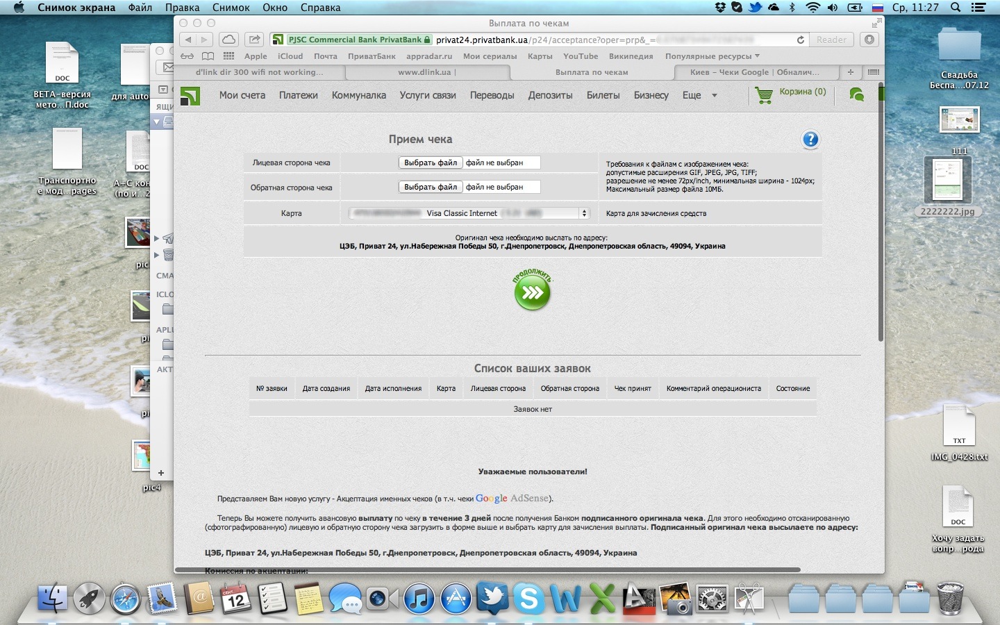 Сделано? Обратите внимание: заявка должна отобразиться в таблице ниже, а система должна предложить вам, внимание, отправить чек в Днепропетровск. Если кто не в курсе – именно там находится главный офис ПриватБанка.
