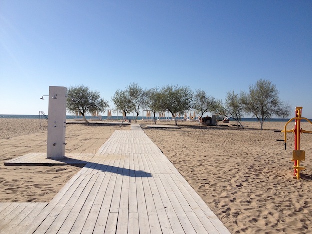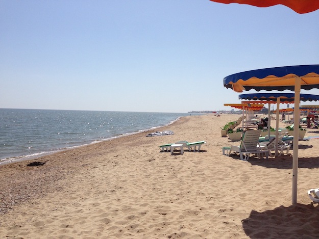 Очень интересная система бронирования шезлонгов. Сейчас расскажу: за 20 грн. в день на человека в комнате администрации вы покупаете брелок с карабинчиком. На пляже стоят шезлонги. У шезлонгов есть петельки. Вы приходите на пляж, видите два незанятых, зацепляете свои карабинчики за петельки – все, шезлонги забронированы за вами. Можно спокойно идти на обед – никто их не займет. Когда они уже больше не нужны, забираете и уходите. Теперь эти шезлонги свободны и их может забрать кто-то другой. Здорово!