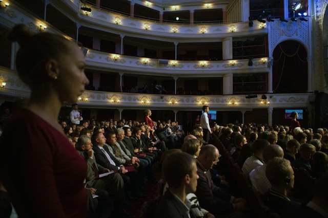 Во-первых, я приятно удивлен размахом. “Публичные дебаты”, напомню, проходили в зале Театра русской драмы. Весь партер был занят гостями, то бишь зрителями, а непосредственно выступающие находились на сцене театра. Очень символично, особенно если вспомнить широко известную фразу Шекспира 😉 Настораживало лишь наличие организованных групп людей, которых, мне показалось, попросили присутствовать для наполнения зала.