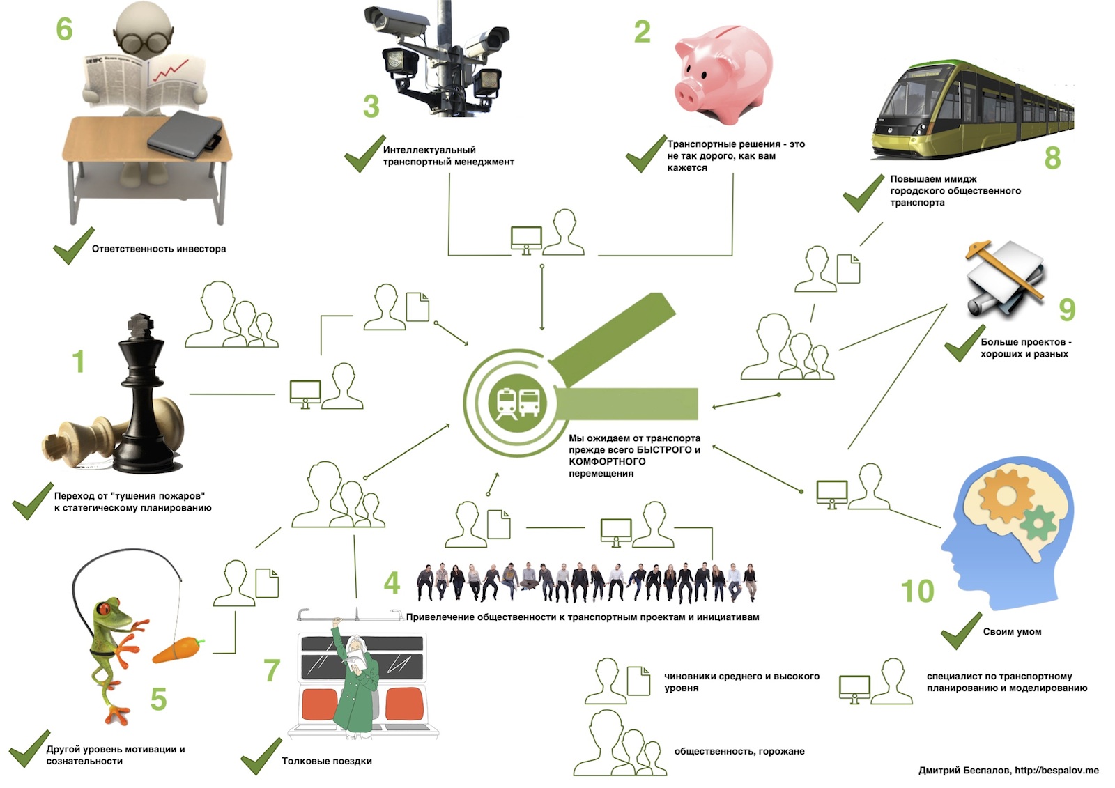 Транспортные проекты чересчур сложные и их смысл понятен только узкому кругу профессионалов? Значит гнать таких “профессионалов” нужно куда-подальше. Транспортный проект должен быть понятен на всех уровнях: от простого горожанина до профессора университета. Да, это заставит проектировщиков сделать не один, а три отчета о работе. Да, прийдется делать визуализацию, но ее сейчас не делает только ленивый. Да, проект прийдется повозить по куче общественных слушаний и много где еще защитить. Да, для этого прийдется иметь (отрывать) проект-менеджера, но такая у него, по-сути, работа. Но результат тут очень “вкусный”: более глубокое понимание проблематики и как результат – большая вероятность нахождения того самого самого верного решения.