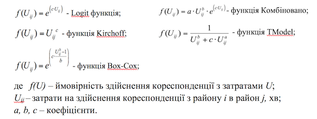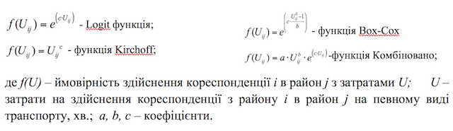 В транспортних моделях міст на етапі розподілу попиту використовується такі основні функції оцінки: Logit, Kirchoff, Box-Сox, Комбіновано, виду: