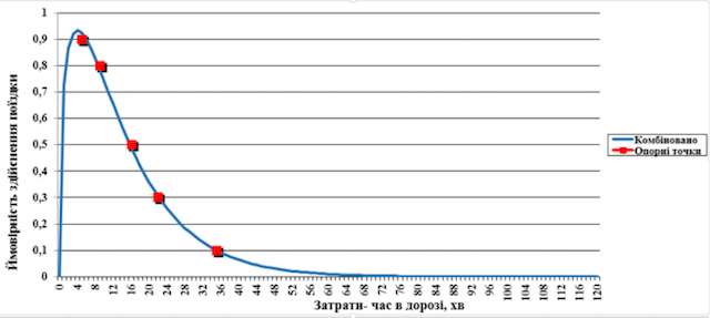 Розподіл шарів попиту відбувається на основі функції оцінки (оцінки ймовірності здійснення переміщення з району i в район j). Функція оцінки визначається для кожного шару попиту на основі опитування населення міста про дальність (ймовірність) і середній час поїздки (рис.7).