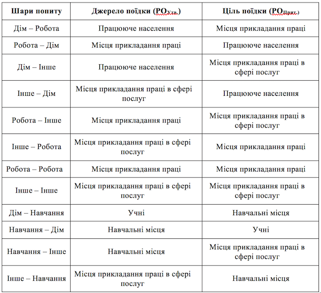 У місті існує велика кількість видів діяльності, які утворюють відповідний обсяг переміщень і мають джерело та ціль. Тому для спрощення розрахунку попиту на транспорт (що не впливає на точність його результатів) такі зв’язки, а відповідно види діяльності, узагальнюються. Для транспортної моделі міста сформовано 10 найхарактерніших видів діяльності (шарів попиту): Дім –Робота, Дім – Навчання, Дім-Інше, Навчання – Дім, Робота – Дім, Робота – Робота, Робота – Інше, Інше – Дім, Інше – Робота, Інше – Інше,та визначені джерела та цілі поїздок (табл.2).
