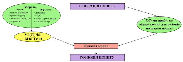 Розподіл шарів попиту по режимам руху відбувається на основі функції оцінки: Logit, Kirchoff, Box-Сox, Комбіновано, виду: