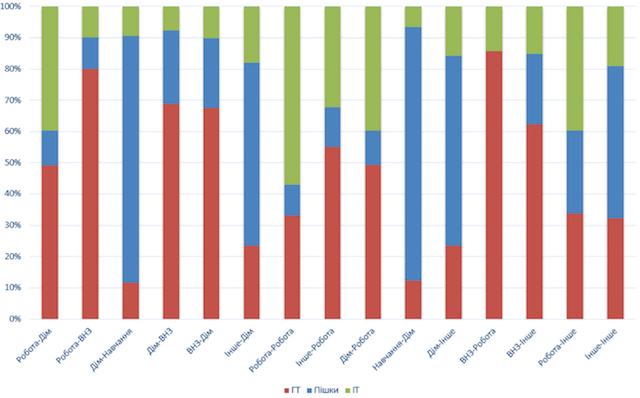 В отличие от Берлина, в Киеве соотношение распределения перемещений на работу и домой является идентичным и составляют 49% на OТ, 40% – ИТ, 11% – пешком (рис 7).