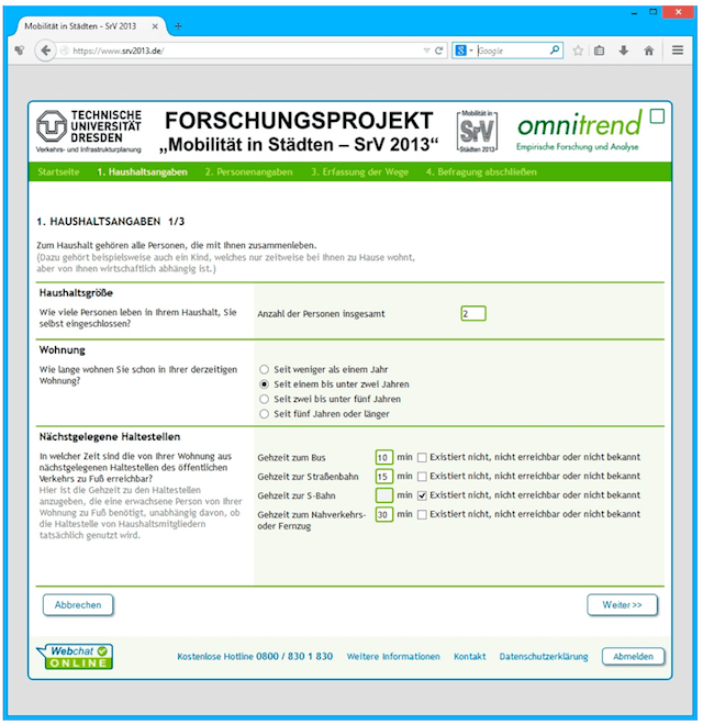 Рис.2 Пример СAWI анкеты SrV (https://www.mobilitaet-in-staedten.de)