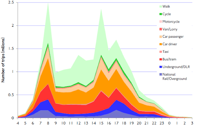 Данные о передвижении жителей указывают, что в 2009-2010гг. каждый житель города Лондон осуществлял в среднем 2,4 перемещения в рабочий день и тратил на это в среднем 1 час 10 минут. Средняя продолжительность перемещения составляла 28 мин, при среднем расстоянии передвижения 3,6 км [10].