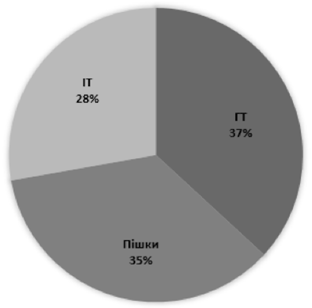 Распределение средств передвижения для ежедневных поездок в Киеве (2014 г.) составлял для ОТ – 37%, ИТ – 28%, пешком – 35%, (рис. 5).