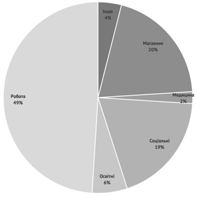 По результатам опроса были получены данные распределения перемещений по видам средств передвижения (рис. 5) и целям поездок (рис. 6).