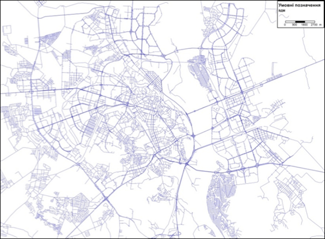 Модель транспортного предложения для Киева была получена при помощи геоинформационного ресурса Open Street Map (OSM – «открытая карта улиц) – это некоммерческий веб картографический проект по созданию свободной географической карты мира. После импорта OSM в PTV Visum, транспортная сеть была тщательно проверена и отредактирована. Каждый элемент транспортного предложения проверялся вручную. Для рёбер графа задавались количество полос движения, скоростной режим движения, пропускная способность, наличие одностороннего движения, разрешённые для движения системы транспорта, а для узлов – разрешённые и запрещённые манёвры, наличие светофорного регулирования, задержки при манёврах. Модель транспортного предложения г. Киева состоит из 20864 узлов и 52324 отрезков (рис.1). Исходными данными для проверки параметров УДС, являлись схемы организации дорожного движения, панорамные видеосъёмки с ресурсов Яндекс-Карты и Google-Карты.