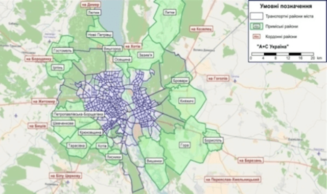Исследуемая территория Киева и пригорода была разделена на транспортные районы (ТР) с учётом административно-территориального деления города, однородности территории по функциональному зонированию; границы районов проводились по межмагистральным территориям, естественным и искусственным рубежам (реки, линии железных дорог и т.д.), препятствующим свободному пешеходному передвижению [2]. Отдельными пригородными транспортными районами в область модели были включены города-спутники.