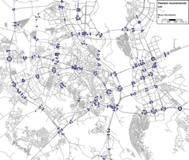 На практике используются различные методы сбора данных об интенсивности движения индивидуального транспорта. Для транспортной модели Киева обследование проводились в утренний (с 9 до 10) и вечерний (с 18 до19) часы пик с использованием переносных видеокамер, которые позволяют производить съёмку на всем обследуемом узле одномоментно. Обследование проведено на 80 основных узлах, магистральных улиц города (рис.6). Видеоматериалы обрабатывались с использованием специализированного программного обеспечения, которое позволяет осуществлять ввод количества транспортных средств с видеозаписи и в автоматическом режиме заполнять базу данных обследования. Значение замеров интенсивности движения транспорта в пиковые часы приводились к суточным значениям по методике КНУСА [5].