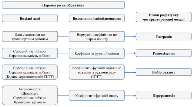 Калібрування проводиться на кожному кроці чотирьохкрокової транспортної моделі (рис.1) [4]: