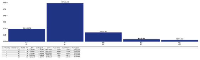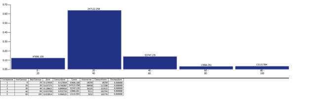 Даний підхід дозволяє оцінити, як розподіляється обсяг транспортного попиту по інтервалах часових витрат. В результаті будуть отримані гістограма і таблиця розподілу часток загального обсягу транспортного попиту по часових інтервалах. На рис.2 зображено, як розподіляється транспортний попит ІТ по часових інтервалах 0-20 хв, 20-40 хв, 40-60 хв і 60-80 хв. Вісь абсцис на даній гістограмі – час здійснення кореспонденцій, вісь ординат – частка обсягу кореспонденцій, що здійснюються в заданий проміжок часу.