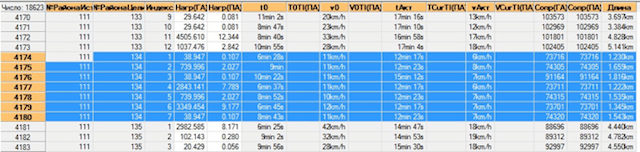 На наведеному рисунку видно, що між цими районами 111 і 134 існує 7 навантажених шляхів. Для кожного з шляхів виведена основна інформація – довжина, час і швидкість в незавантаженій мережі (t0 і v0), а також актуальні час і швидкість шляху. Порівнявши розраховані значення актуального часу і швидкості шляхів з натурними значеннями, можна зробити висновки про адекватність параметрів СR функцій. Такий аналіз рекомендується проводити для різних точок, що знаходяться на різних відстанях, в різних районах міста, з тим щоб виділити можливі невідповідності на різних ділянках ВДМ.