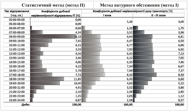 Натурні обстеження інтенсивностей руху транспорту в Києві почали проводити з 1963 року. За результатами виконаних досліджень, кафедрою міського будівництва Київського інженерно-будівельного інституту (КНУБА), розроблена методика [1] приведення значень інтенсивності руху транспорту (ІРТ) до добових за допомогою коефіцієнтів нерівномірності (Таблиця 1), а дослідження інтенсивності руху на мостових переходах з підходами, дозволило встановити години з найменшими коефіцієнтами варіації, найбільш надійні для проведення вибіркових обстежень інтенсивності. Дана методика була апробована при багатьох обстеженнях інтенсивності транспортного руху в м. Київ, а також у всіх обласних центрах України.
