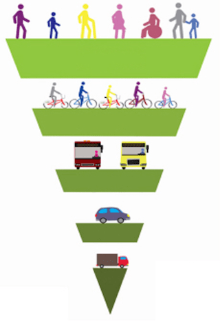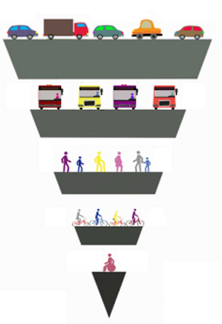 3. Принцип следования пирамиде приоритетов участников городской мобильности. Данный принцип гласит, что в своих решениях все менеджеры, связанные с транспортом в городе, их принимающие, должны отдавать приоритет, прежде всего, устойчивым видам транспорта: пешеходам, велосипедистам и общественному транспорту. Это должно быть видно не только и не столько в риторике, сколько в конкретных вещах, например, распределении профильного городского бюджета.